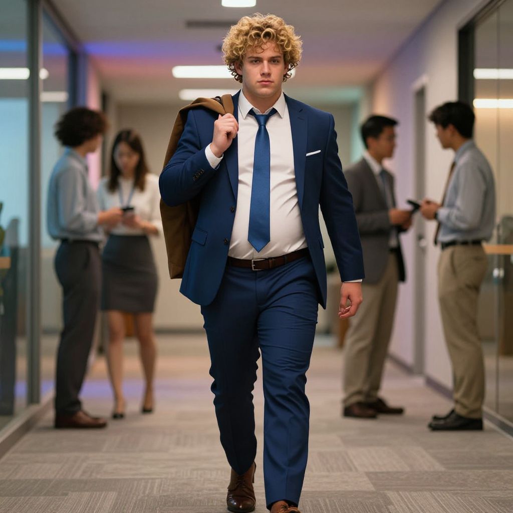 In this highly detailed and vivid image, a young man with curly blonde hair and an extremely handsome face is walking confidently down an office hallway, drawing attention with his large, round, and bulging beer belly, which is accentuated by his tight-fitting suit. His muscular arms and big, round, fat belly are prominently displayed, creating a striking contrast with the other individuals in the background who are casually dressed and engaged in their own activities. The warm lighting and epic bokeh effect enhance the dramatic atmosphere, while the colorful lighting adds depth and dimension to the scene. The man's attire, consisting of a white shirt, blue tie, and blue pants, is complemented by brown shoes, and he carries a brown jacket over his shoulder. The overall composition, with the man in the foreground and the other people in the background, creates a sense of depth and perspective, emphasizing the man's presence and the bustling office environment. The image is captured with high resolution, rich colors, and intricate details, making it a photorealistic representation of a moment in a modern office setting.