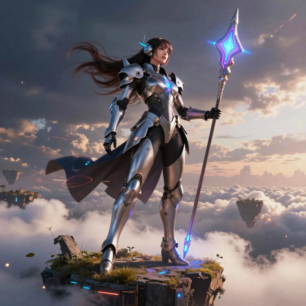 Midjourney woman with futuristic armor, holding a glowing staff, standing on a floating island above clouds, vibrant neon light accents, cyberpunk-meets-fantasy fusion, dramatic sky background, dynamic pose, detailed character design