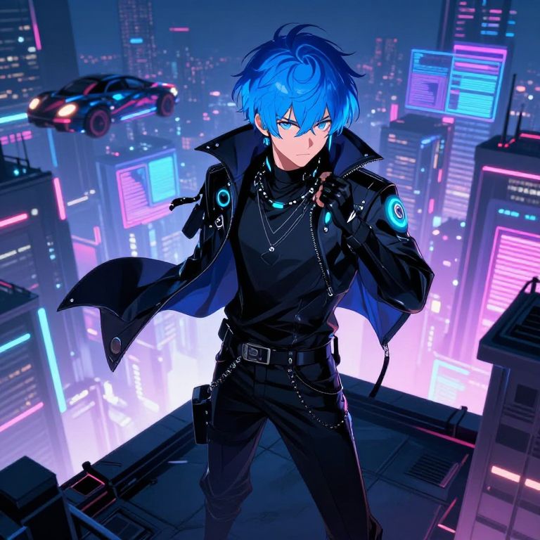 Anime guy blue hair standing on a futuristic city rooftop under neon lights, wearing a sleek black jacket and glowing accessories, intense expression, dynamic pose, cyberpunk style, detailed background with flying cars and holograms, vibrant colors