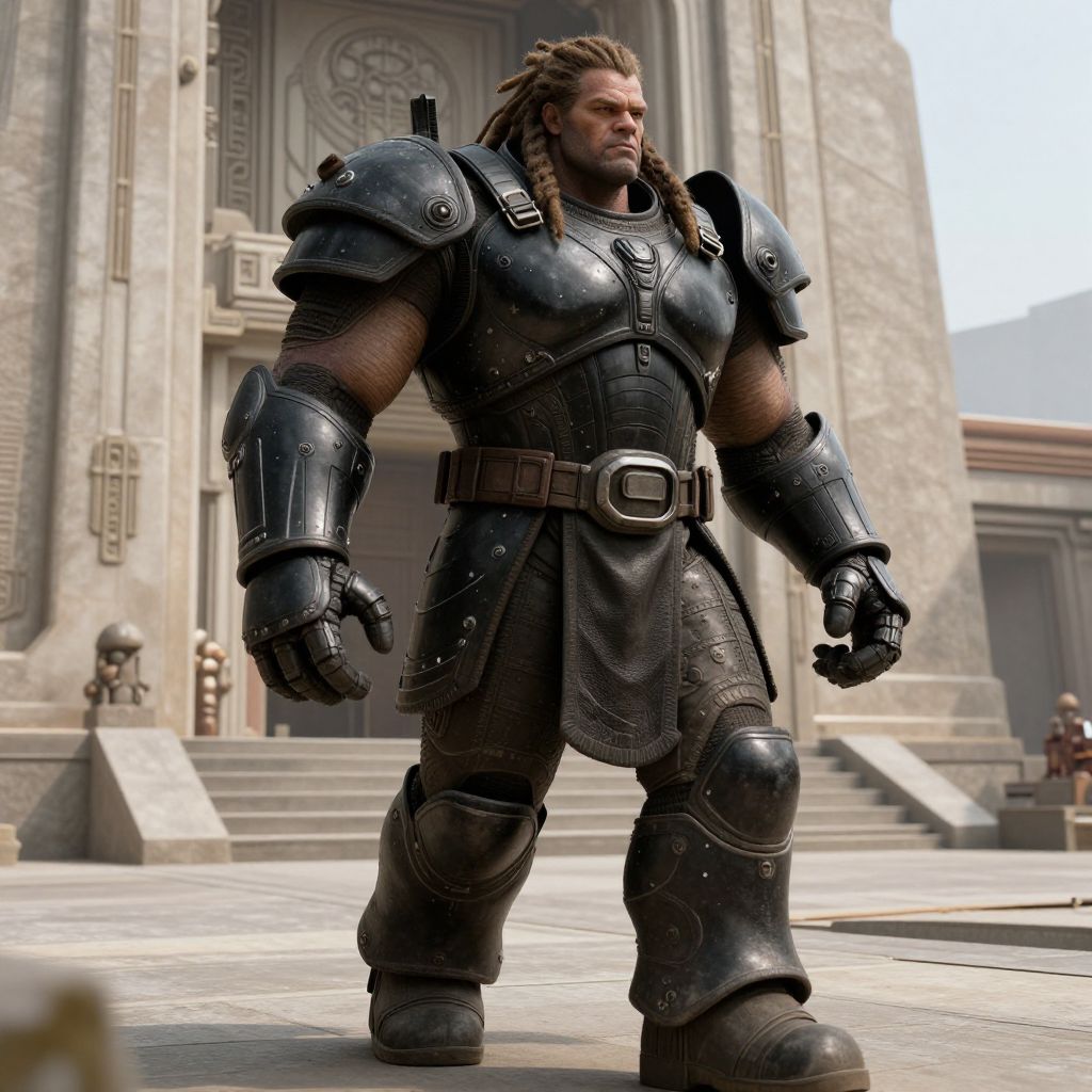 Fan dark an ancient art style, very hulking man, with dreadlocks, cybernetic black armor, large massue, walking past in front of star wars temple of coruscant ruins