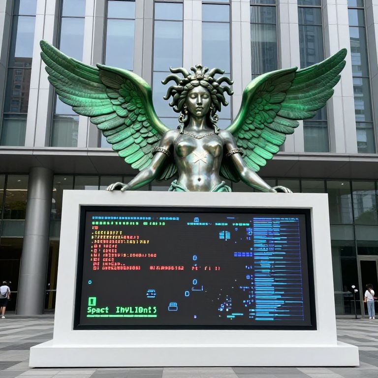 The image features a striking sculpture of a winged figure, reminiscent of Medusa, with a modern twist. The figure, crafted from a metallic material, is adorned with intricate green wings and a crown, exuding a sense of both ancient mythology and contemporary art. The sculpture is positioned on a white pedestal, which houses a digital multimedia interface screen displaying various codes and symbols, including a glitching Space Invaders game. The background reveals a sleek, modern building with large glass windows, contrasting with the classical figure. The overall composition suggests a blend of historical and technological elements, symbolizing the intersection of past and present. The scene is set in a public space, with a few people visible in the distance, adding a sense of scale and context to the artwork.