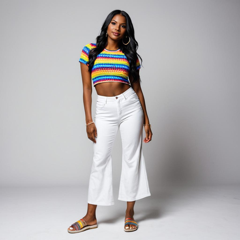 Full body portrait of a slim, dark-skinned woman with long black hair, wearing a vibrant, rainbow-patterned, short-sleeve cropped top paired with high-waisted white pants. She stands confidently against a plain gray background in a studio setting, wearing multicolored sandals and large hoop earrings.