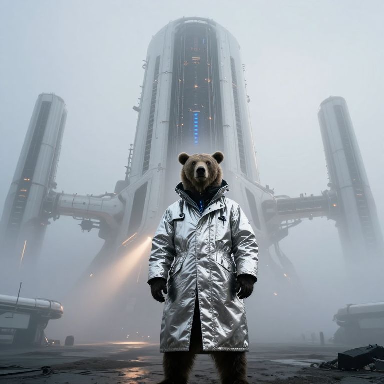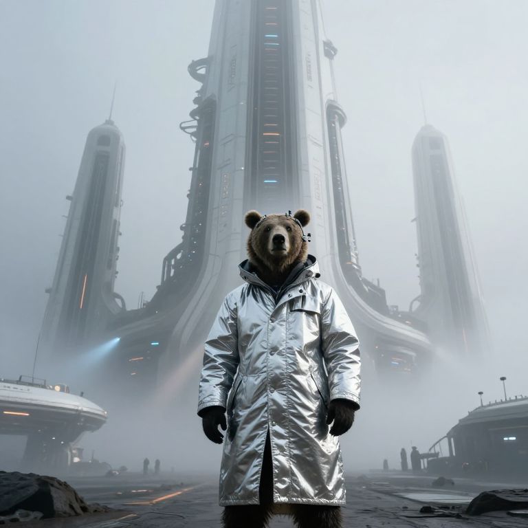 A grizzly bear scientist that stands before Artemis Station, looking at the viewer, They wear a long, insulated trench coat made of reflective, metallic fabric that shimmers in the pale sunlight, The coat has a high collar, partially concealing their face, while their head is covered by a hood lined with futuristic gadgets—small sensors and antennas scanning the environment, Their eyes, visible beneath the hood, have a faint glow, suggesting cybernetic enhancements, Visualize Artemis Station as a towering, enigmatic structure rising from a cold, fog-laden world, The massive white spires stretch skyward, their dark metallic surfaces glistening with condensation from the mist, Each tower is adorned with intricate, glowing lines of orange and blue lights, hinting at the advanced technology within, The fog is thick at ground level, muffling sounds and creating an eerie, quiet atmosphere, while faint mechanical hums reverberate through the air, In the distance, other towering monoliths fade into the fog, creating a sense of endlessness, The lighting is soft and diffused, with occasional beams piercing through the fog from docking bays, casting long, dramatic shadows, The camera is set at ground level, looking up at the overwhelming scale of the station, emphasizing its imposing and mysterious nature