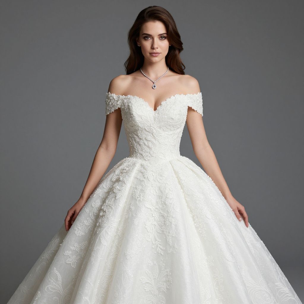 Photograph of a young woman with fair skin and dark brown, wavy hair, standing against a solid gray background. She is wearing an off-the-shoulder, white, lace-trimmed wedding gown with a full, voluminous skirt adorned with intricate floral patterns. The dress features a fitted bodice with a sweetheart neckline, accentuating her medium-sized breasts. She wears a simple silver necklace with a small pendant. Her expression is neutral, and she stands with her hands gently resting on the sides of her skirt. The lighting is even, highlighting the texture and details of the lace.