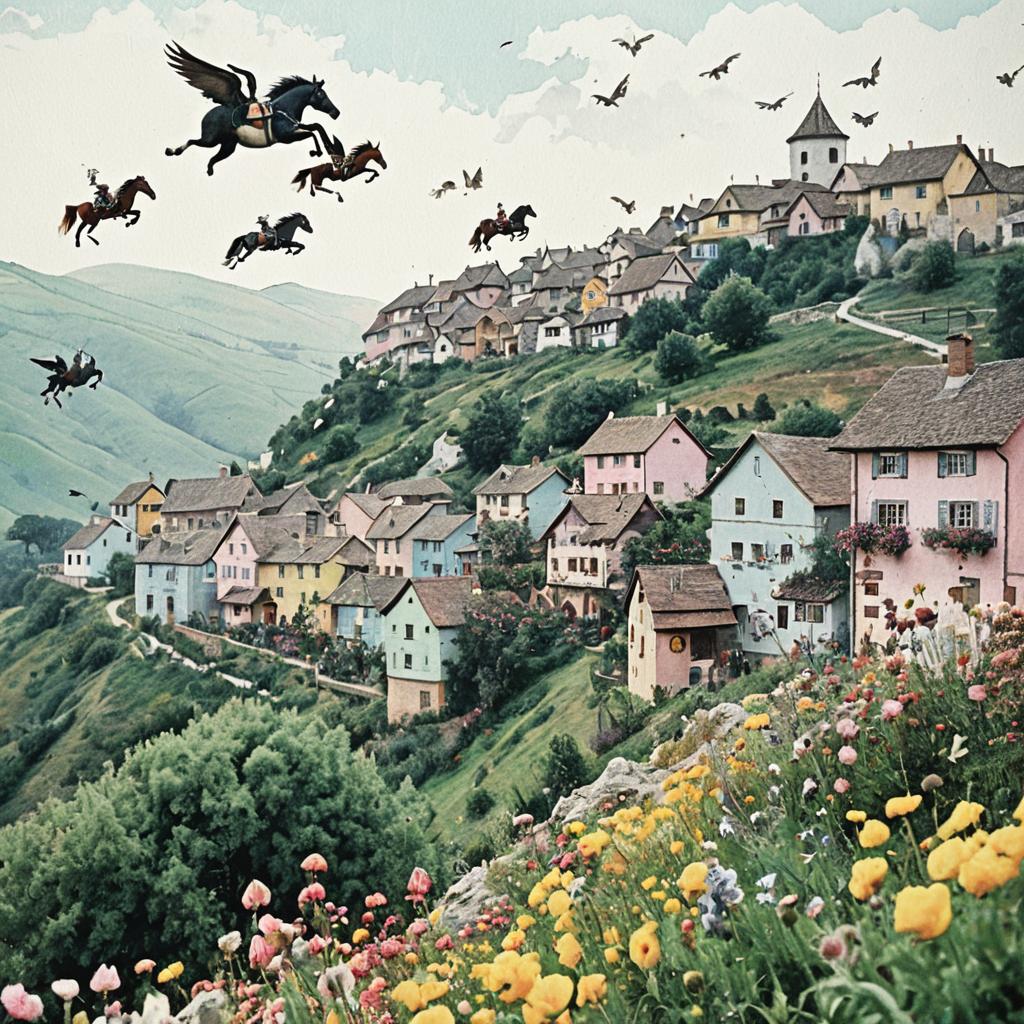 Watercolor illustration of a pastel-colored hillside village surrounded by lush greenery and wildflowers. The scene includes flying griffins and horses above the village, capturing a fantastical and serene landscape with rolling hills and detailed rural architecture.