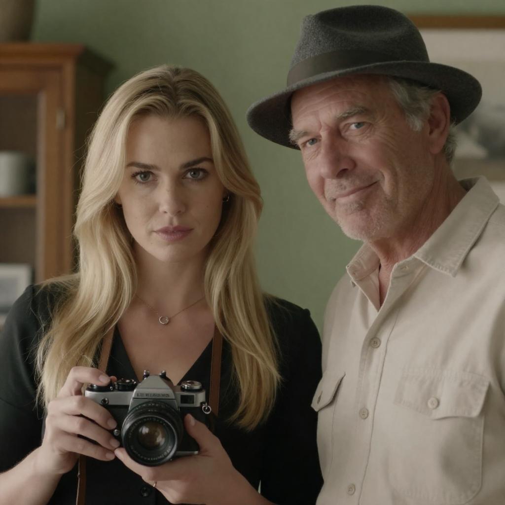 Photograph of a man and woman indoors. Woman with long blonde hair, wearing black top, holds a vintage camera. Man with grey hat, beige shirt, smiles slightly. Warm lighting, green walls, wooden furniture. Woman's intense gaze, man's gentle smile.