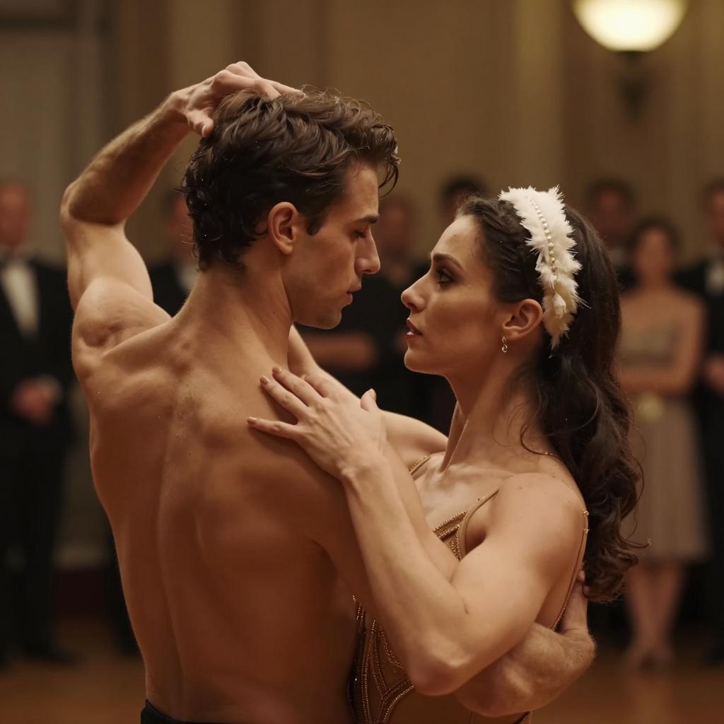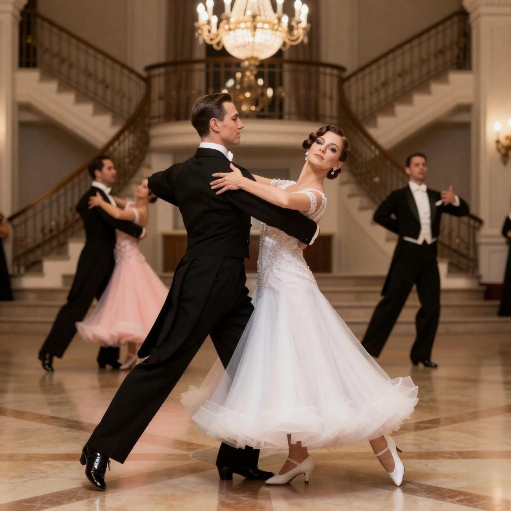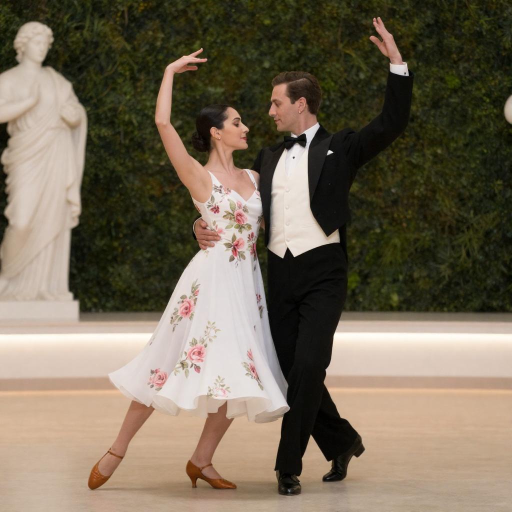 Dancing couple, woman in white floral dress, man in black suit with white vest, arm raised, in front of green hedge backdrop. Statue on left, illuminated floor, elegant poses, focused expressions. Both mid-step, graceful movement.