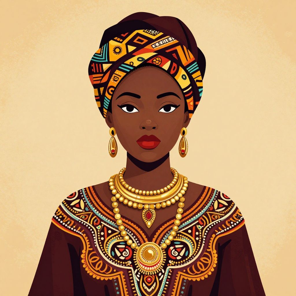 A vibrant vector illustration of an African woman adorned in traditional attire featuring intricate tribal ornaments, including a patterned headwrap, gold jewelry, and a detailed embroidered top, set against a warm, textured background with a vintage aesthetic.