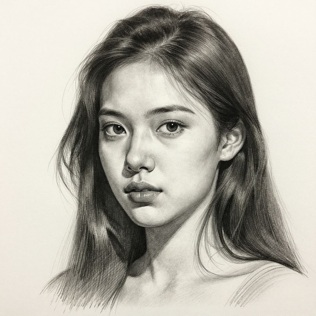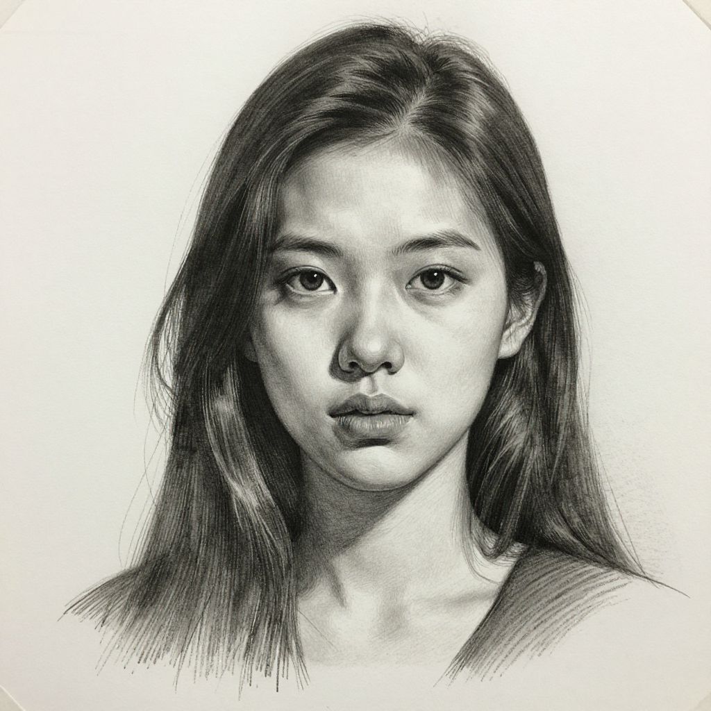 Detailed black-and-white pencil drawing of an East Asian woman with long hair, neutral expression, and delicate features, centered on a white background.