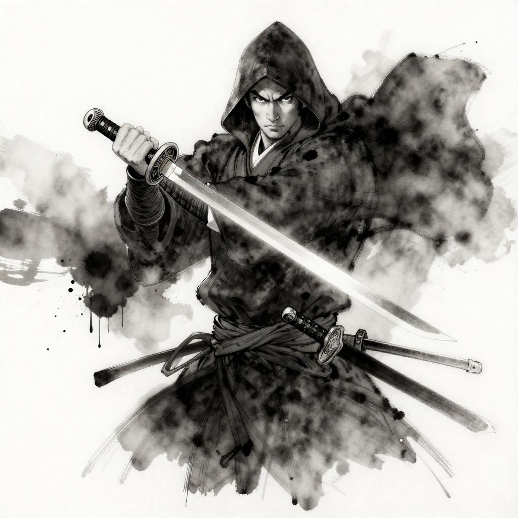 Monochromatic ink drawing of a male samurai with intense expression, holding a sword in a dynamic pose. His hooded cloak flows with motion. Background is abstract with dark splatters on the left. Samurai's right arm is forward, left arm back.