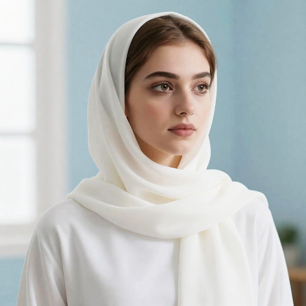Photograph of a young woman with fair skin and light brown hair, wearing a white headscarf and white long-sleeve top. She has a neutral expression, looking slightly to the right. Background: light blue, ured wall, window with daylight.