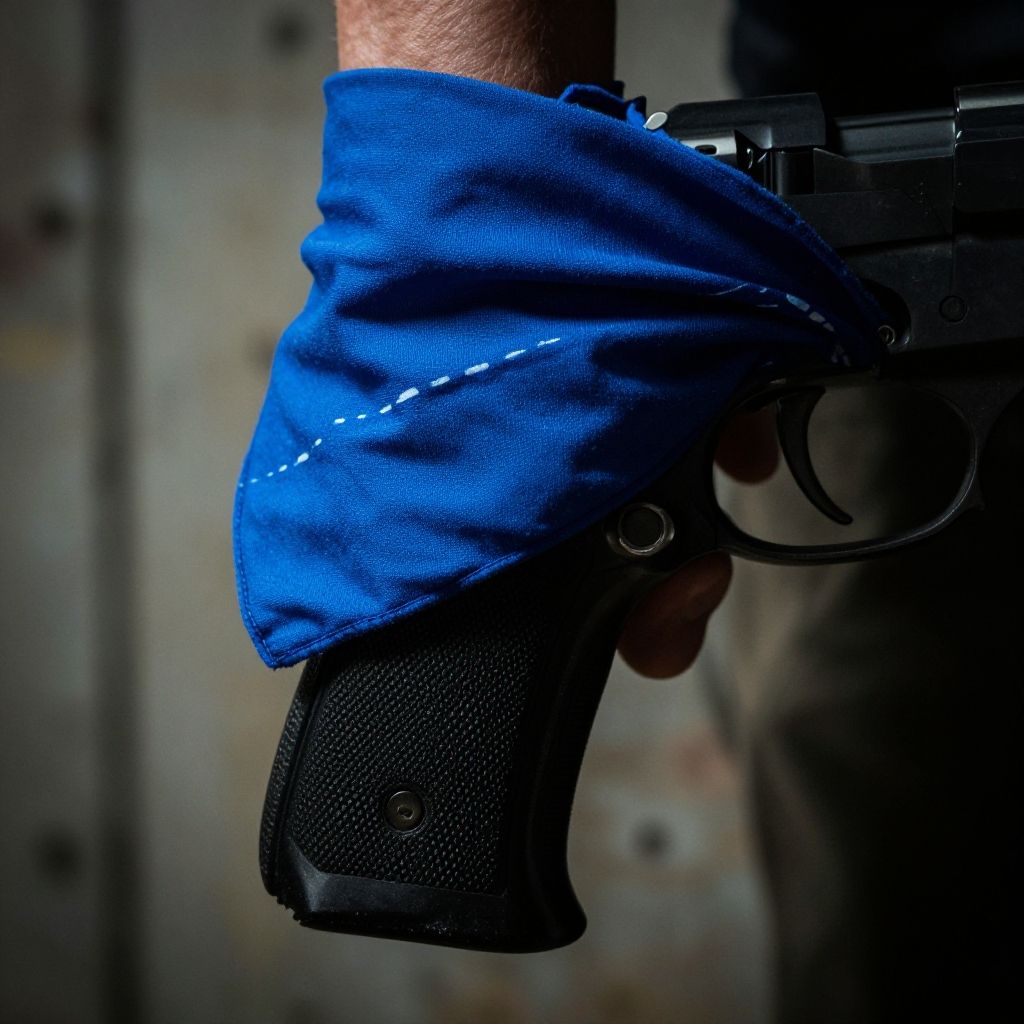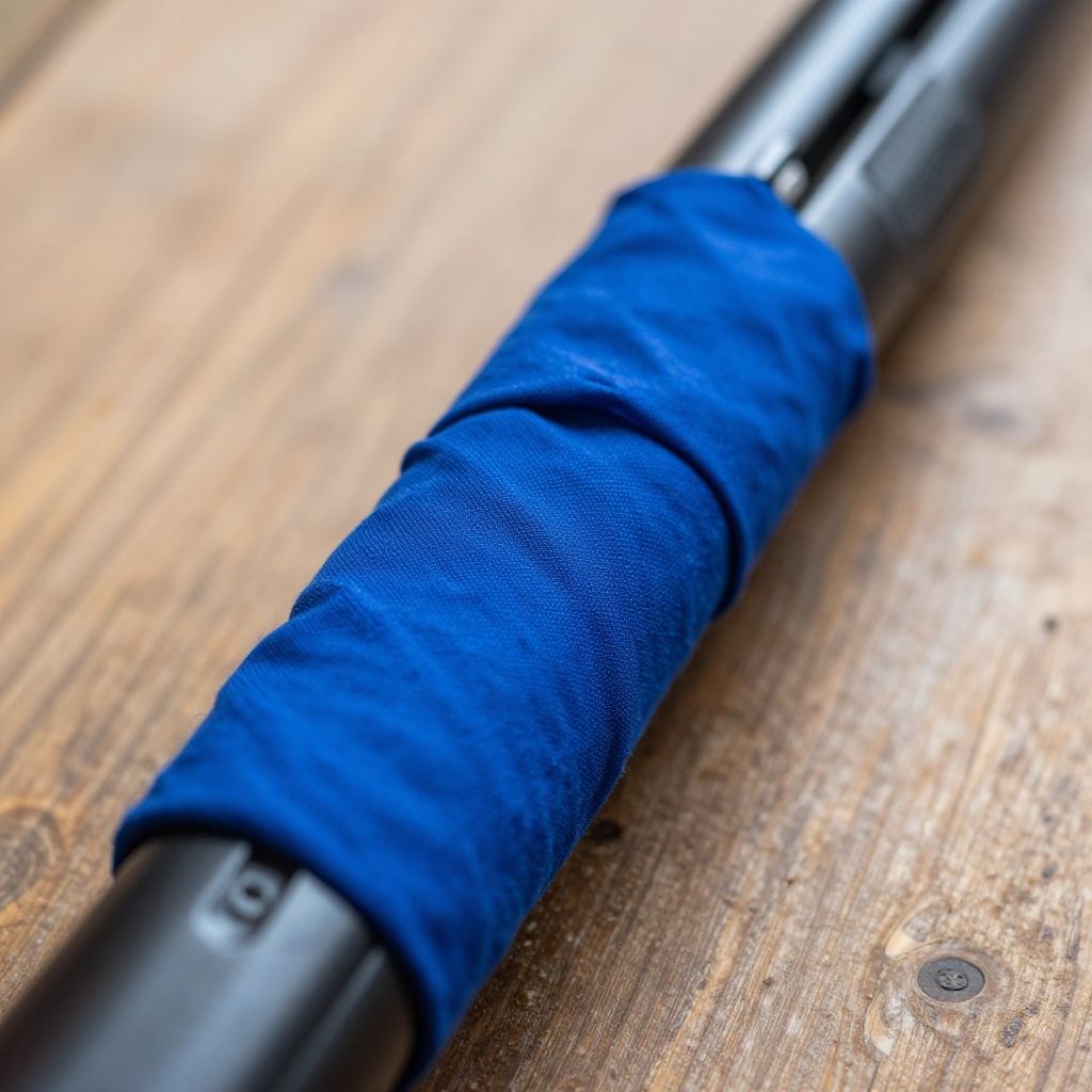 Close-up of blue bandana wrapped around gun barrel, soft natural light, rustic wooden table background, depth of field showing fabric texture and gun engravings, photorealistic