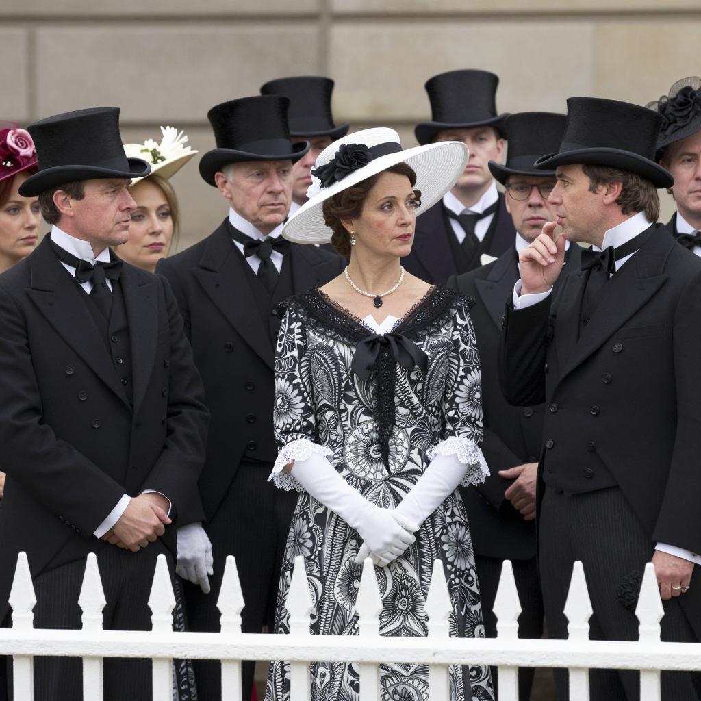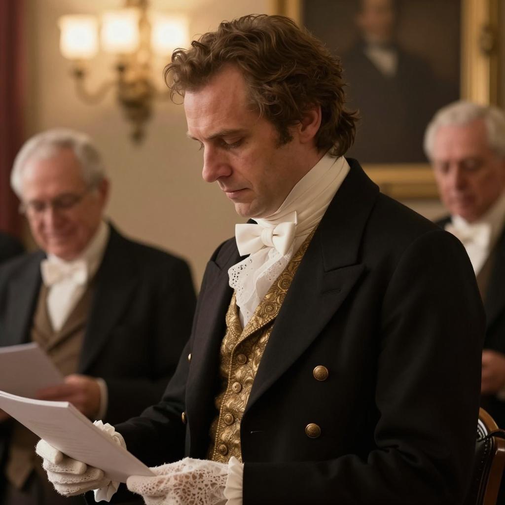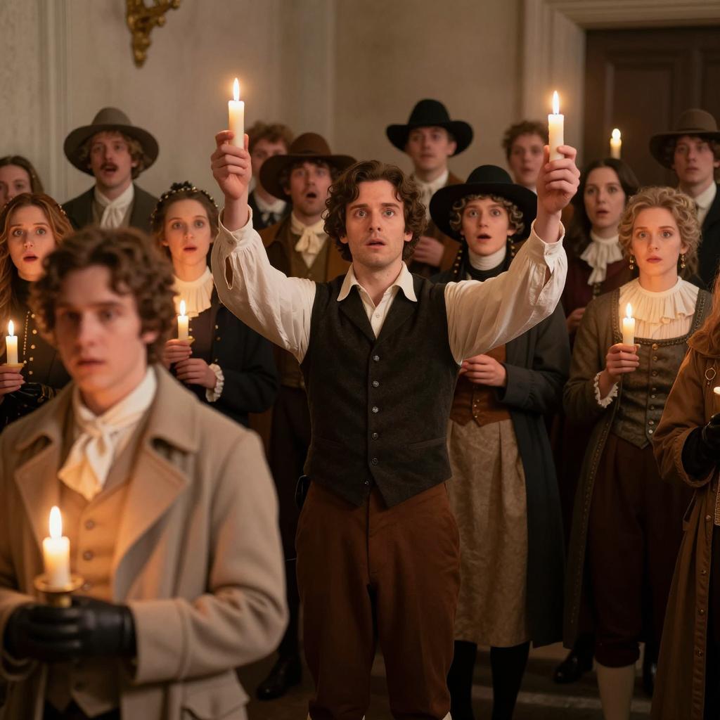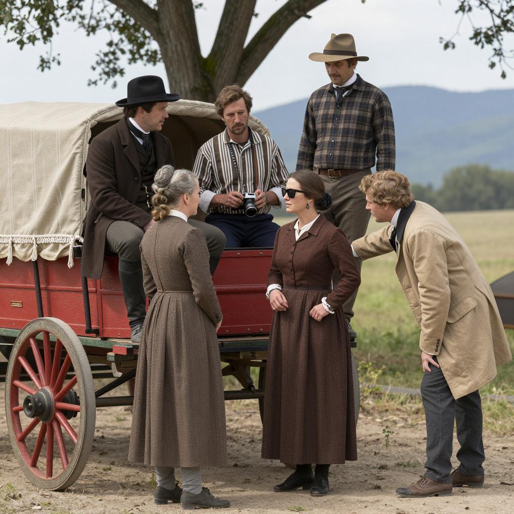 Photograph of a large crowd of men, women, and children in 19th-century clothing. Central man with dark hair, olive skin, and brown coat gestures with right hand. Crowd faces forward, diverse expressions. Background includes wooden structures and vehicles.