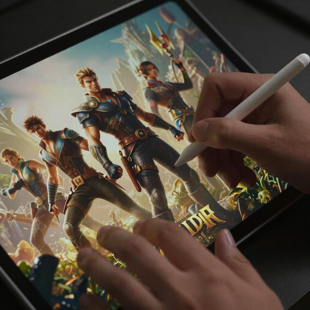 Close-up on a game cover art maker's hands using a stylus on a high-resolution tablet screen, creating a dramatic game cover with heroic characters and dynamic action poses, realistic textures, intricate details, and a powerful, exciting mood full of creativity.