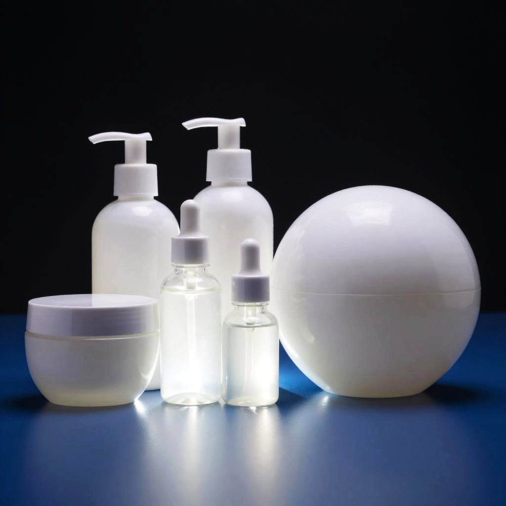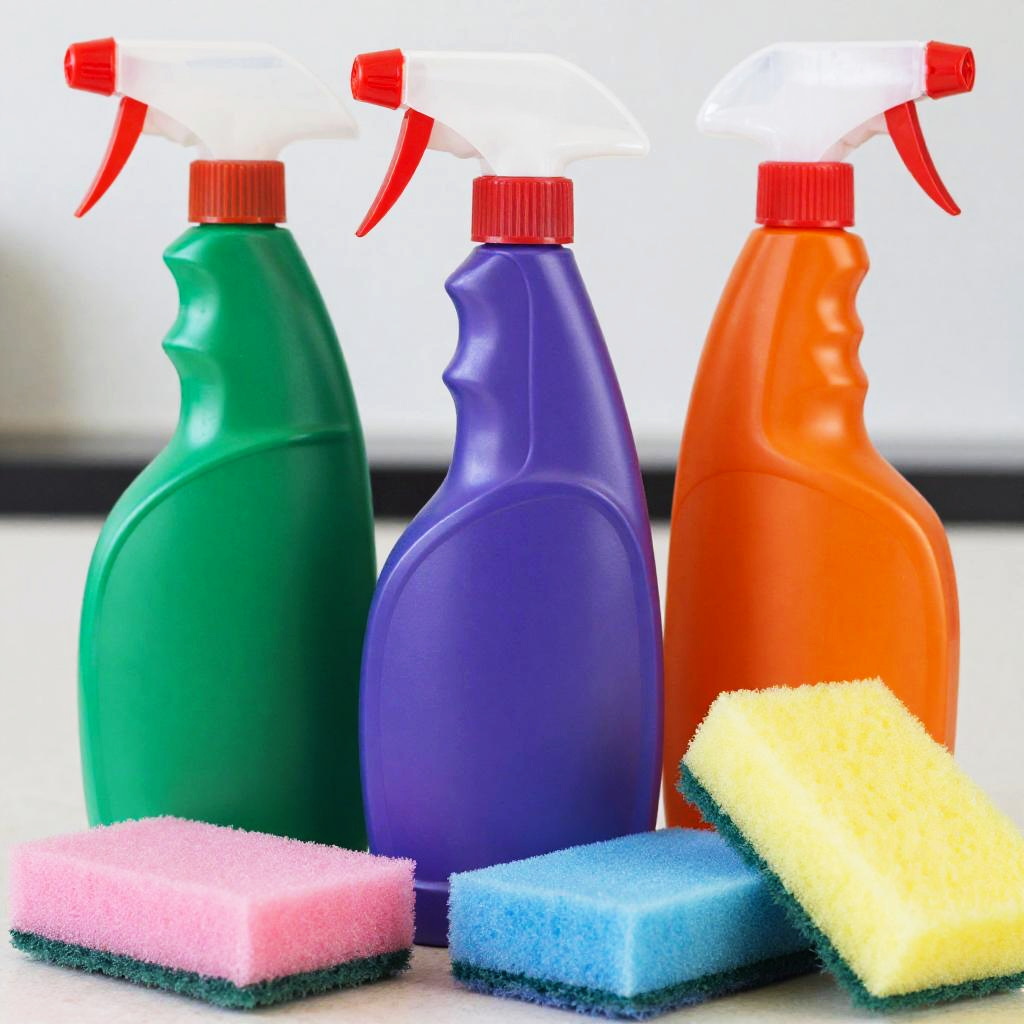 This is a digital image of a row of colorful, translucent plastic bottles and spray cans lined up on a red shelf against a bright white background. The bottles are various shapes and sizes, featuring vibrant colors like orange, green, purple, blue, and white. The spray cans are silver with black nozzles. The image has a clean, modern look with sharp contrasts.