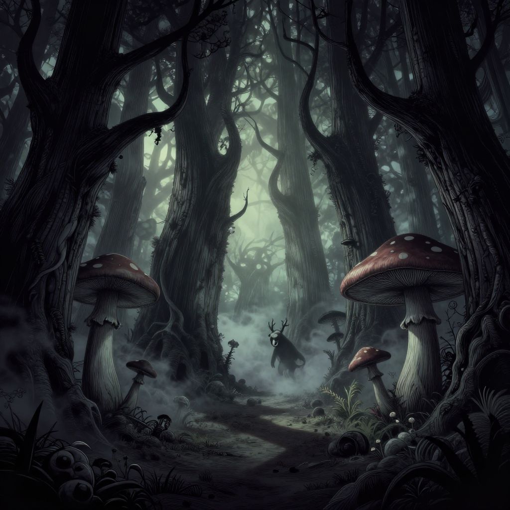 A Tim Burton filter transforms a whimsical forest with crooked, towering trees and oversized mushrooms, shadows cast with heavy contrast, fog swirling around, strange creatures peeking out, all rendered with a gothic, dark fantasy aesthetic and stylized linework.