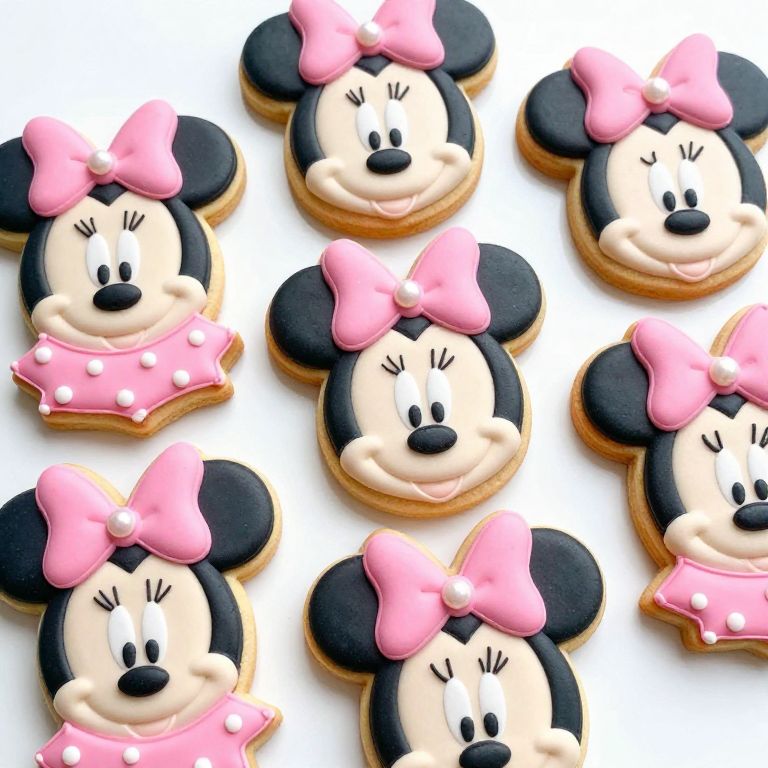 Colorfully decorated Minnie Mouse-shaped sugar cookies, featuring black ears, pink polka-dotted skirts, and pearl-adorned bows, are artfully arranged on a white surface, showcasing intricate details and vibrant designs.