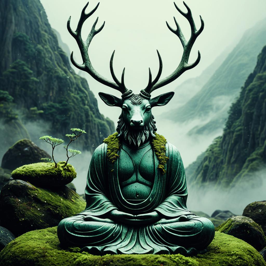 A serene koala philosopher meditating like a Buddha, with an ancient and serene expression. Small eucalyptus leaves sprout from the top of his head, adding a whimsical touch. The scene is set in a lush rainforest, with vibrant, earthy tones inspired by Miyazaki. The composition blends anime elements with a fantastical, mystical atmosphere, creating a serene yet surreal mood.