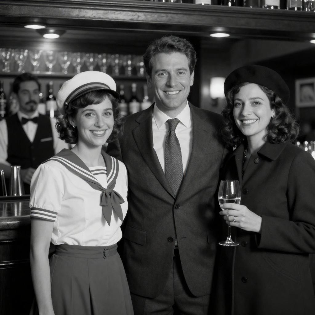 Black-and-white photograph of three people in a bar. A man in a dark suit and tie stands in the center, smiling. A woman with short, wavy hair and a sailor-style dress with a hat stands to his left. Another woman with dark, wavy hair and a beret, wearing a dark coat, stands to his right, holding a wine glass. A bartender with a mustache stands in the background. All three are smiling. The bar has shelves with glasses and bottles.