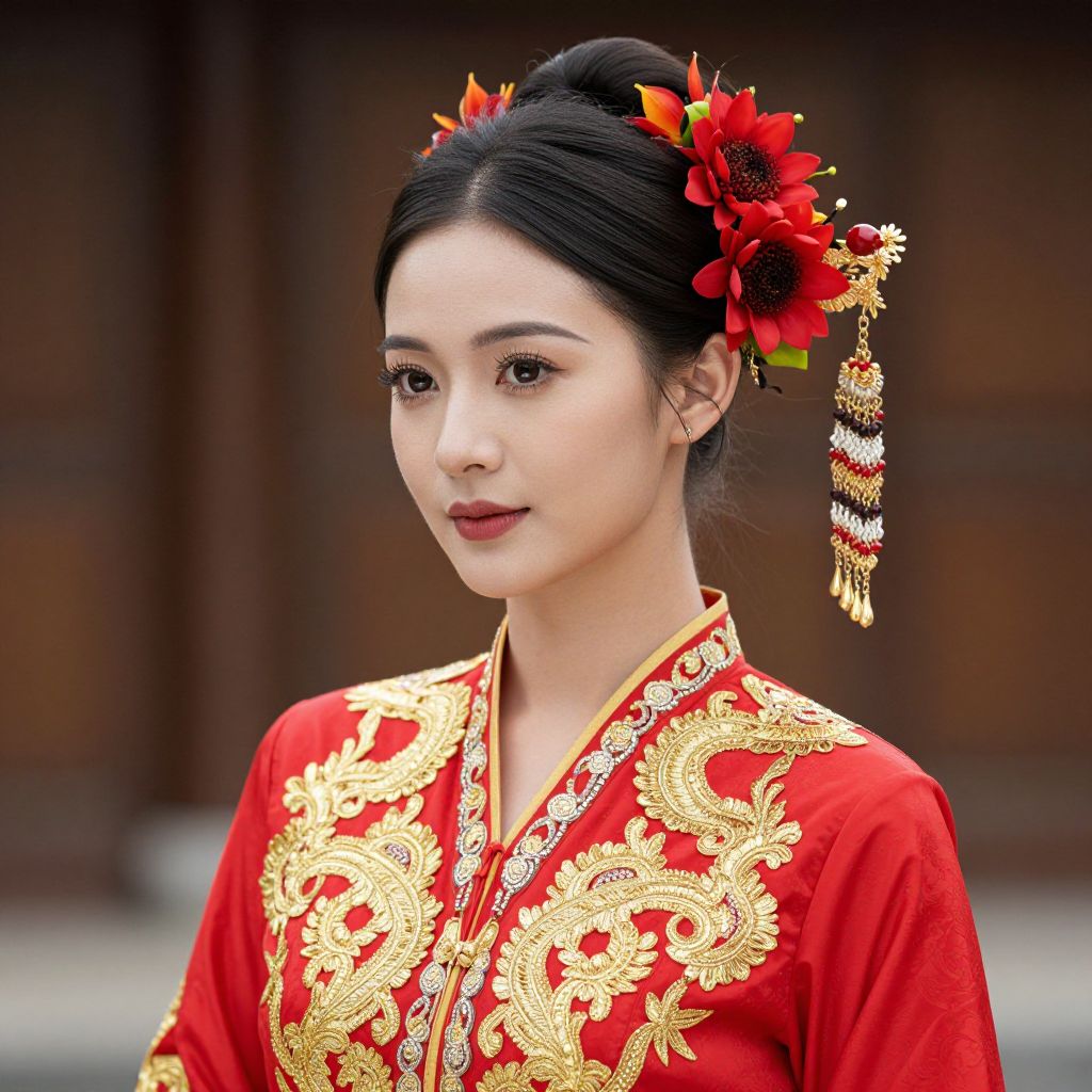 Elegantly dressed woman wearing a vibrant red traditional costume adorned with intricate gold embroidery and complemented by ornate hair accessories featuring red sunflowers and dangling tassels, exuding cultural heritage and timeless beauty.
