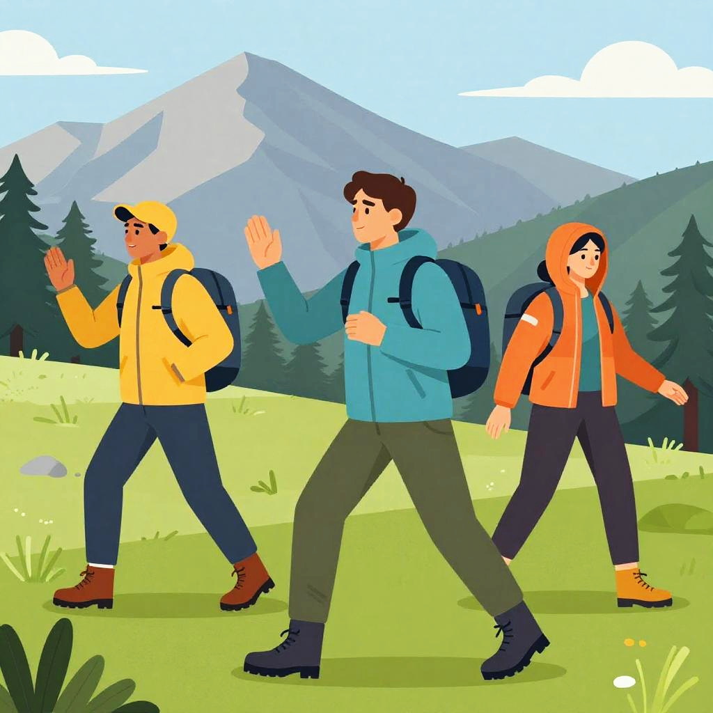 Kleidung in der Natur, moderne Outdoor-Bekleidung auf Wanderern, lebendige Herbstfarben, dynamische Posen, realistische Lichtverhältnisse, Berge und Wälder im Hintergrund, Fokus auf Material und Funktionalität, digitale Illustration