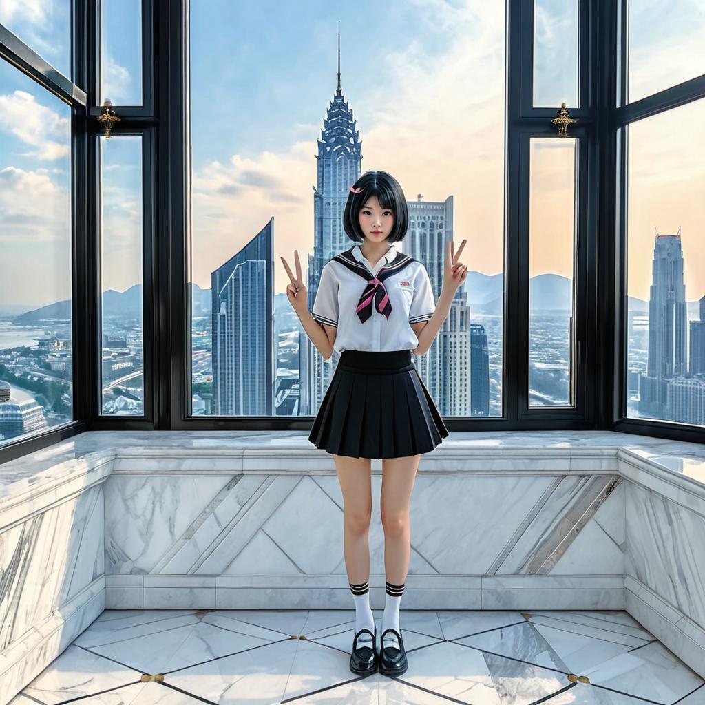 (masterpiece, best quality, excellent quality), ((1girl, solo)), (gradient pink eye, black hair, short hair, school uniform, microskirt, expensive hair ornament), (thigh_gap, groin, narrow waist, skinny stomach), looking at viewer, one hand v sign, (marble wall, marble floor, large window, chandelier), (sky, city, (skyscrapers : 1.5), mountain, hill, sunset)