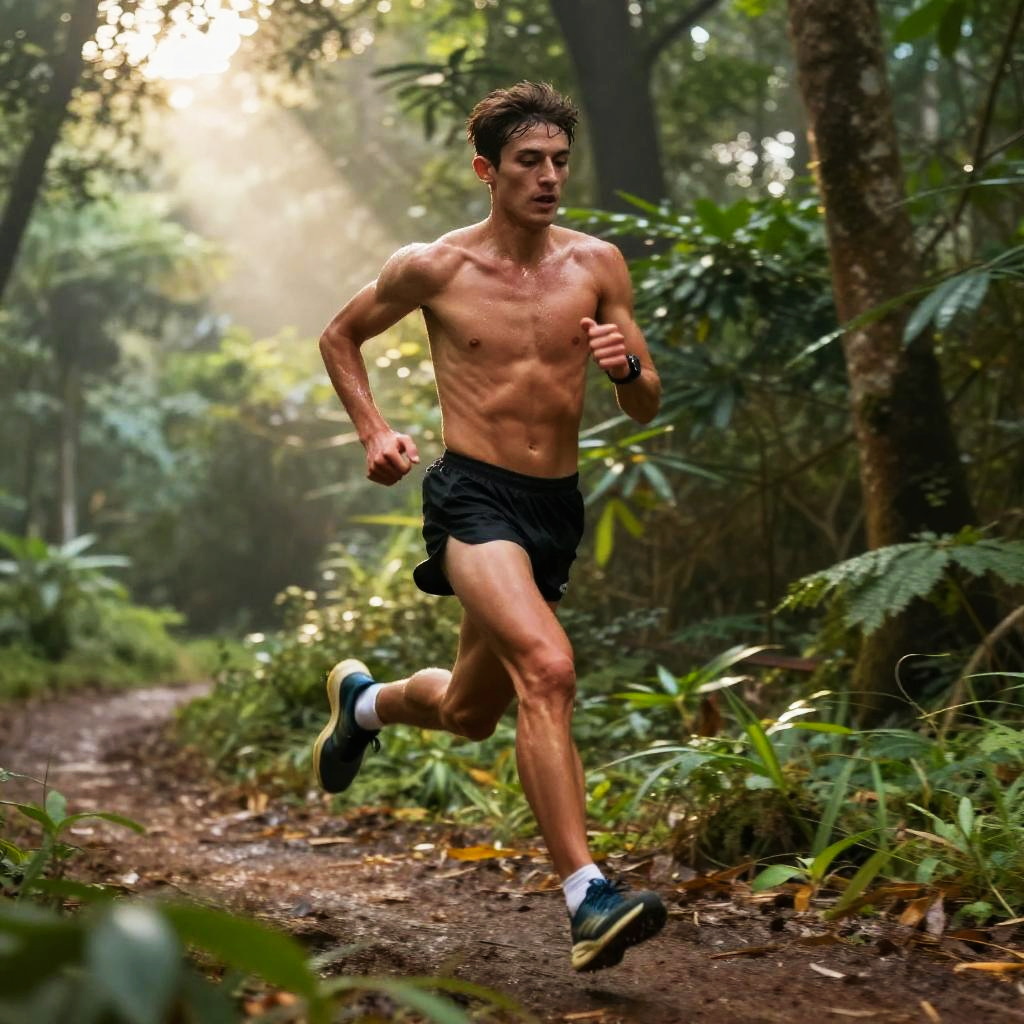 Slender build young athlete running along a forest trail at dawn, dynamic motion blur, vibrant greenery, atmospheric morning fog, highly detailed and vivid nature background