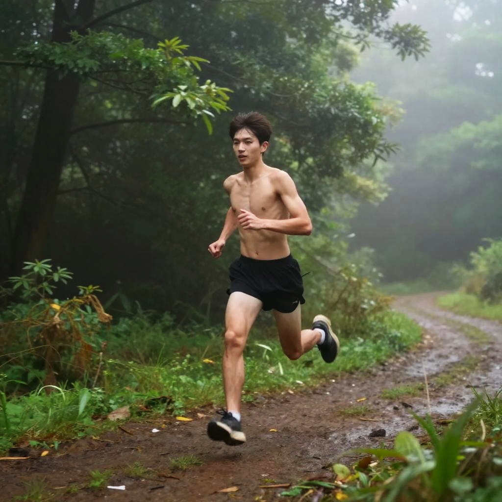 Photograph of a young, slim, Asian man running shirtless on a muddy forest path. He has short, black hair and is wearing black athletic shorts and white sneakers with black stripes. His expression is focused, and his right arm is slightly bent while his left arm is straight. The background features dense, green foliage and trees, with mist creating a foggy atmosphere. The path is wet, with visible puddles and scattered leaves, adding texture to the ground. The overall mood is natural and serene, with the runner appearing determined and in sync with the peaceful forest setting.