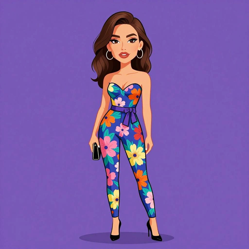 Woman with pretty face and pretty hair. Woman, chic, black jumpsuit with cut-out shoulders, V-neckline, form-fitting silhouette, full-length pants, metallic striped clutch, nude strappy heels. --sref 1467