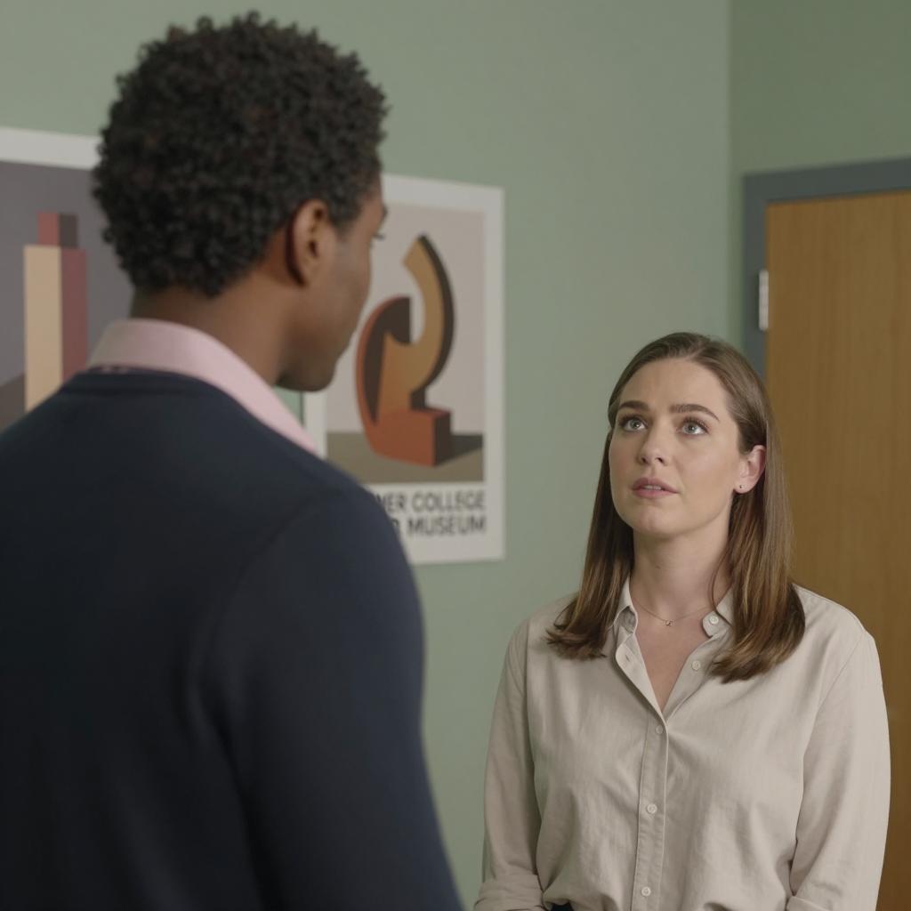 Photograph of two people inside a train. Black man with short hair, white shirt, turned away, facing a white woman with long brown hair in a ponytail, wearing a denim jacket, smiling at him. Background includes a window with green landscape and blue sky. Woman wears large hoop earrings. Man's face not visible. Woman's expression is friendly and engaging.
