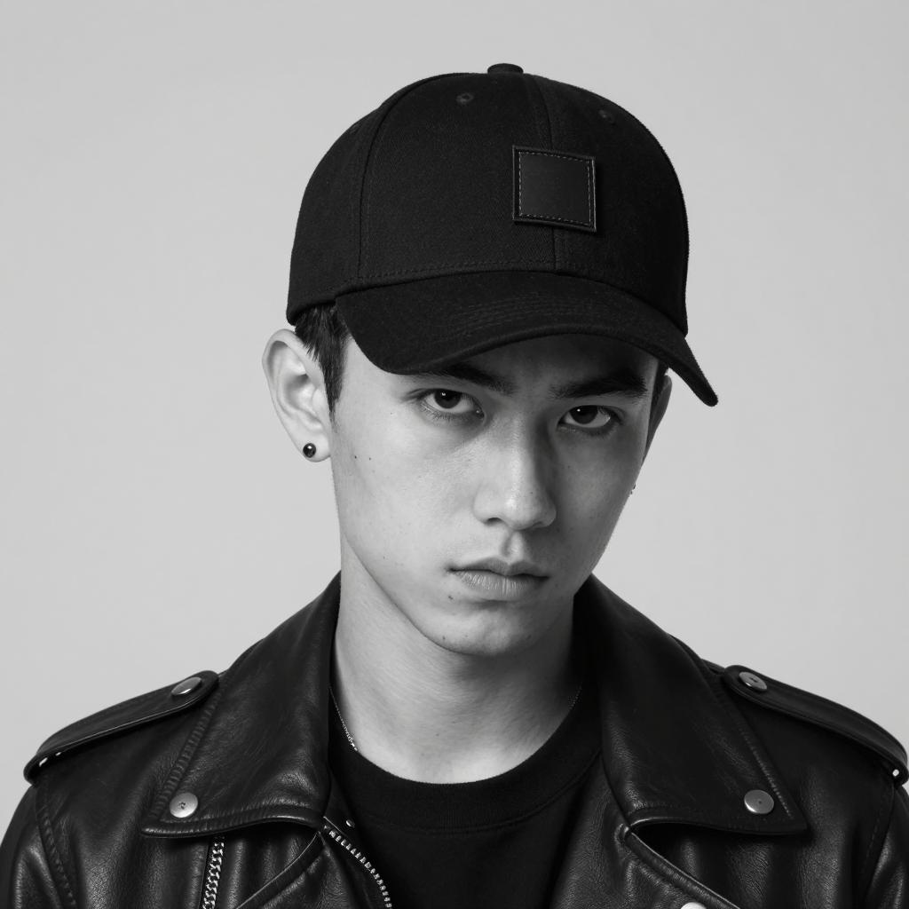 Black and white portrait of a young man with short dark hair, wearing a black cap with a square badge and a button, and black leather jacket with a chain. He has small black ear piercings, strong eyebrows, and neutral expression. His eyes look slightly to the right. The cap's brim shades his right eye. The background is plain and light grey.