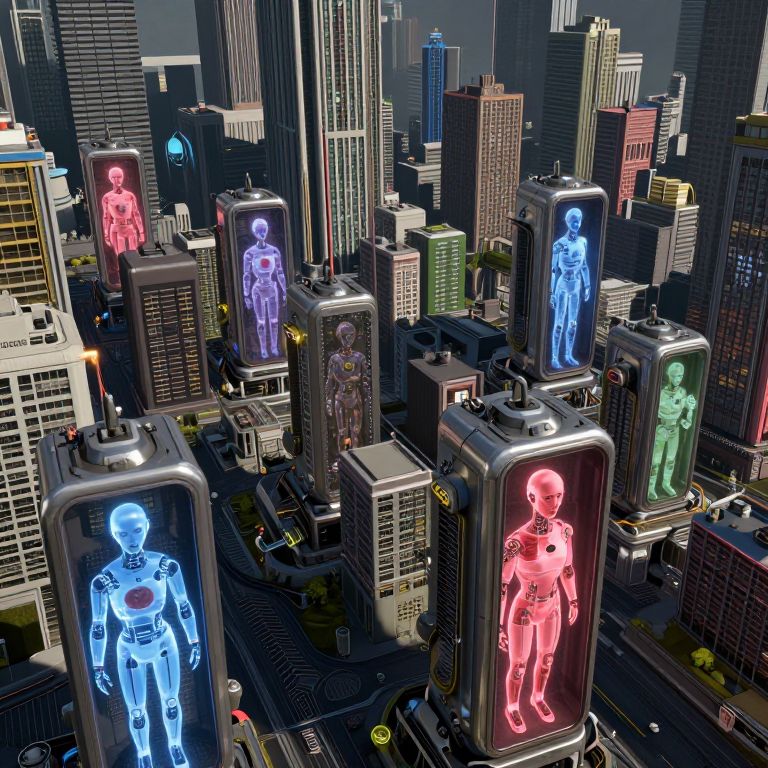 A dystopian cityscape in Unreal Engine, featuring thousands of psychedelic metallic machines with hidden and double images of medical cyborgs, creating a visually stunning and thought-provoking representation of a nightmare future where technology and medicine have merged in a potentially dangerous way.