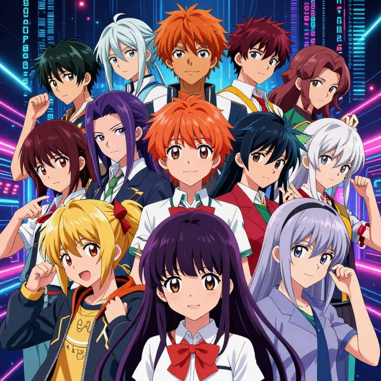 Anime characters generator AI creating a vibrant cast of original anime characters with diverse hairstyles, expressive eyes, and dynamic poses, set against a futuristic digital background with neon lights and AI code streaming, in a colorful and detailed style.
