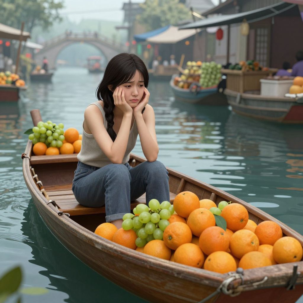Photorealistic digital image of an Asian woman with long black hair, wearing a white sleeveless top and blue jeans, sitting in a wooden boat filled with bright orange oranges and green grapes. She rests her chin on her hands, looking thoughtful. The boat floats on a calm canal surrounded by floating market stalls with more fruits, including watermelons and pineapples. In the background, a blurred arched bridge and more boats are visible, adding depth. The scene is brightly lit with natural light, creating a peaceful and vibrant atmosphere.