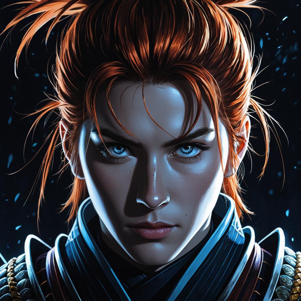 Stunning anime portrait of a blue-haired boy with intense green eyes, close-up, spiky hair, light armor, strong contrast lighting, digital illustration inspired by Yoshitaka Amano