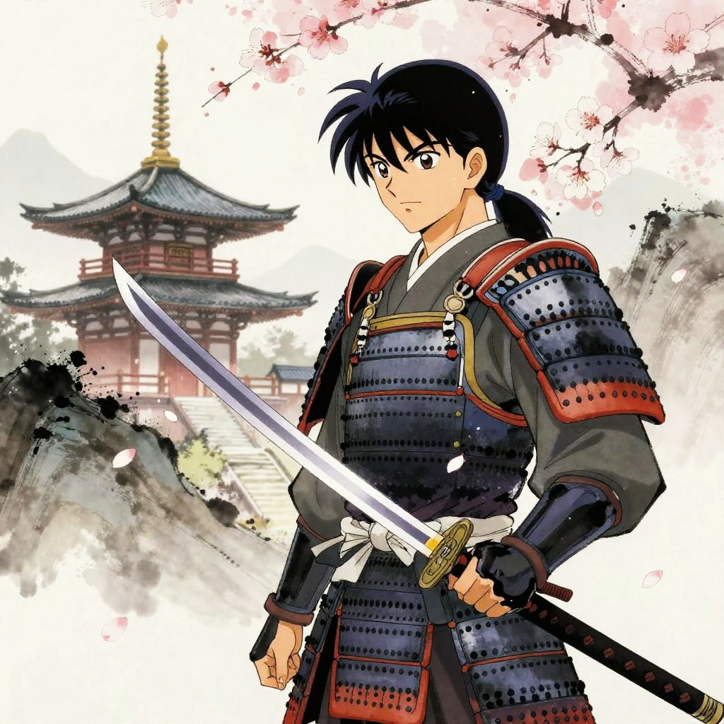 Anime-style drawing of a determined young samurai with black hair, wearing traditional armor, holding a katana, standing before a cherry blossom tree and traditional