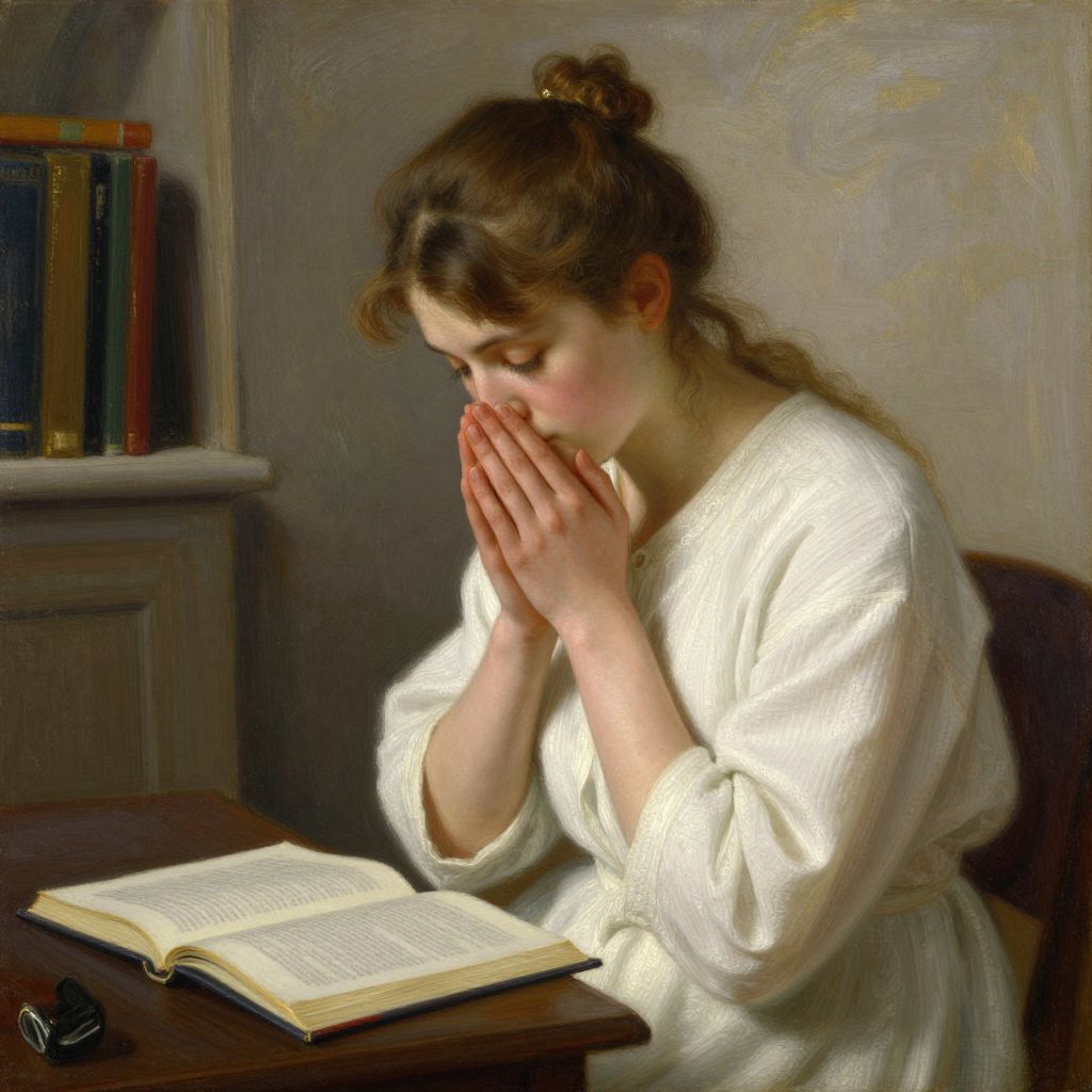 A Victorian-style painting of a pensive woman with brown hair in a bun, wearing a black dress with white lace collar, praying over an open book