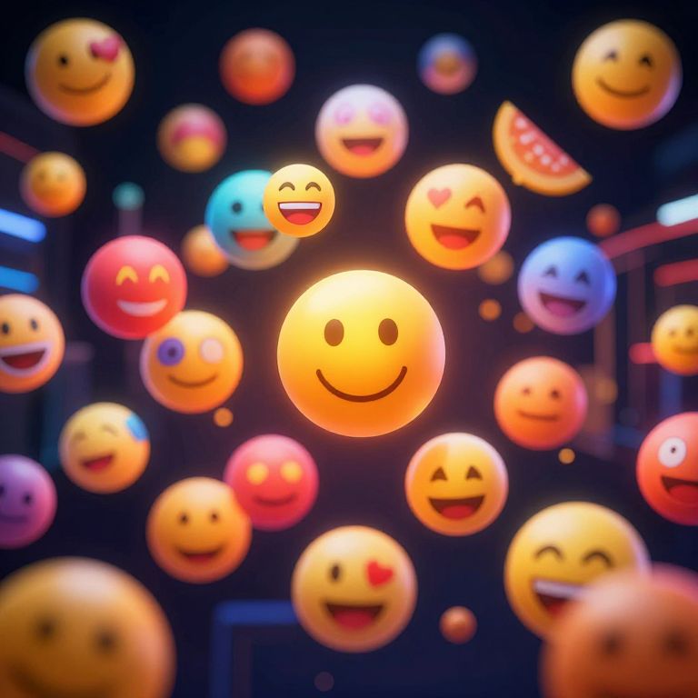 This is a digital CGI image featuring numerous glowing, 3D-style, yellow smiley faces of various expressions floating against a dark blue background. The smiley faces include expressions such as happiness, laughter, winking, and sadness, with some having additional details like a red heart or a single tear. The central smiley face has a simple, classic smile, while others show more varied expressions. The background is subtly lit, with blurred, multicolored lights creating a vibrant, energetic atmosphere. The image has a playful, whimsical feel, with a focus on bright, cheerful colors and expressive faces.