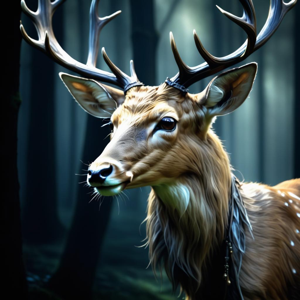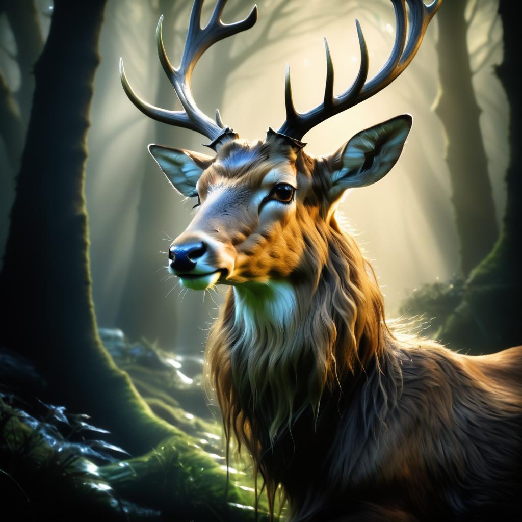 Portrait of a gentle deer as a healer, dramatic lighting, cinematic, ultra-realistic, styled by Brian Froud, Arthur Rackham.