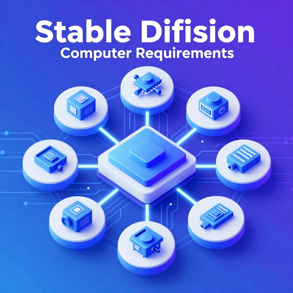 Stable diffusion computer requirements illustrated poster, components arranged in a circle with labels, glowing circuitry background, clean modern graphics, vibrant blue and purple tones