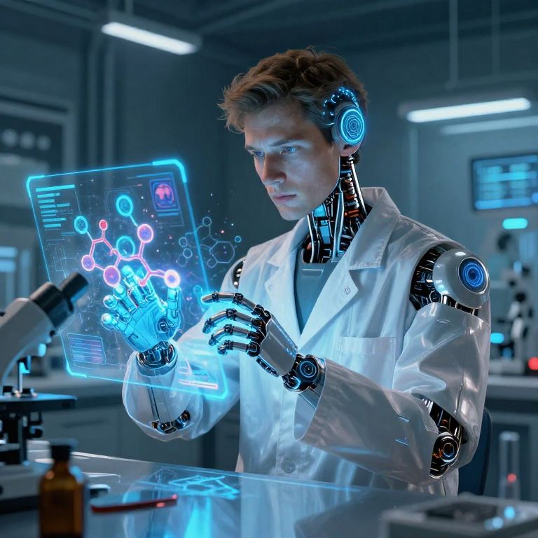 Fusiona-themed digital painting showing a visionary scientist melding advanced biotech and robotics, hands glowing with blue fusion energy, surrounded by holographic interfaces and molecular structures, in a high-tech laboratory filled with ambient light and reflective surfaces.