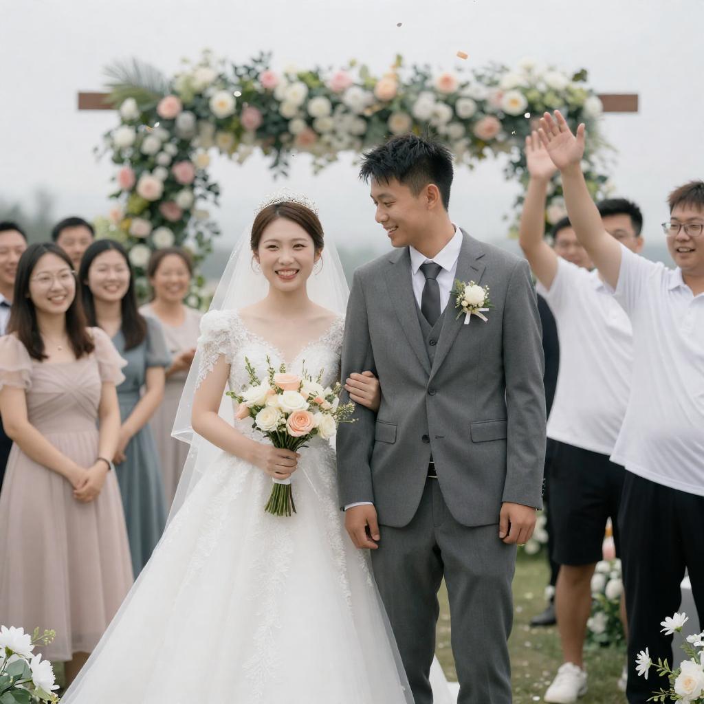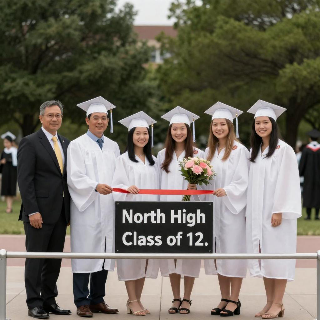Photograph of four male graduates in outdoor ceremony. Rightmost graduate with tattoos, black cap, yellow stole, smiling, hands together. Next man in white cap, yellow stole, smiling. Third man in black cap, white hat, yellow stole, clapping. Leftmost man in black shirt, jeans, standing near keyboard. Background: trees, bright sky. White flowers in foreground. Three golden balloons floating above rightmost graduate's head. Multiple people standing, some partially visible.