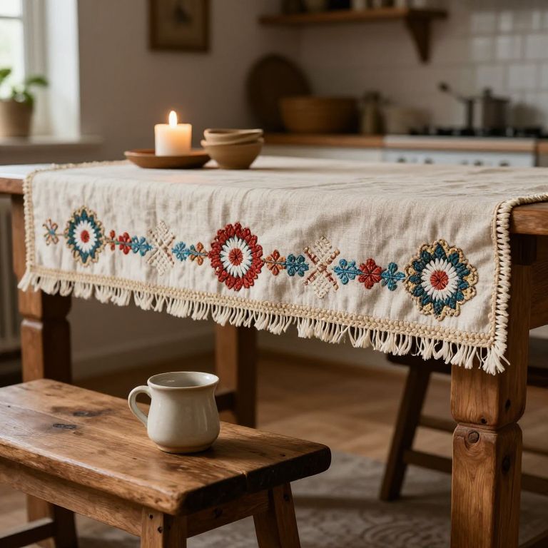 A detailed shot of a decorative border composed of woven linen and embroidered crochet patterns, hanging along the top of a traditional farmhouse dining table, set in a rustic kitchen with warm candlelight, a rustic wooden table, and a ceramic mug on the surface.