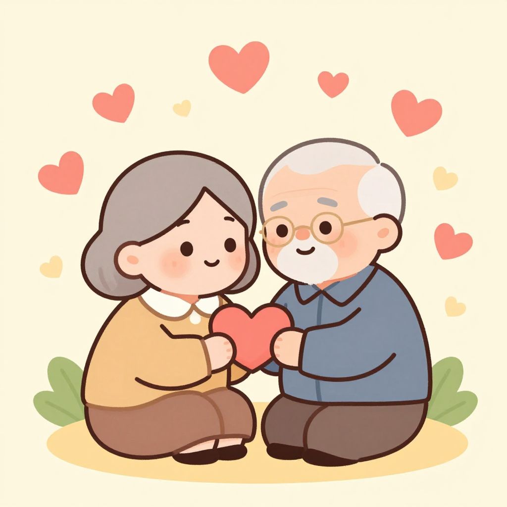 This is a digital cartoon drawing of an elderly couple sitting on the ground, holding a red heart together. The woman, with short gray hair and wearing a beige sweater and brown pants, has a happy expression. The man, with white hair, glasses, and a blue shirt, also smiles. They are surrounded by pink hearts against a white background with small green plants at the bottom. The style is cute and simplistic, with bold outlines and soft colors, evoking a warm, loving atmosphere.