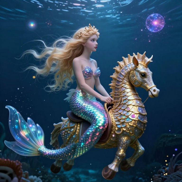 Imagine an enchanting tapestry depicting a mystical world where mythical creatures and nature's wonders intertwine in harmony. Inspired by the whimsical imagination of a renowned artist, this scene brings to life ethereal beings like centaurs and unicorns gracefully roaming through luminous forests under the soft, golden light of twin moons. In the foreground, an alluring mermaid performs a captivating dance on a sandy shore, her fluid movements in perfect sync with schools of iridescent fish that shimmer in mesmerizing colors. This whimsical tapestry should be viewed from the perspective of a curious observer nestled high within the treetops, offering an aerial view that reveals both the intricate details of each character and the enchanting beauty of their magical habitat.