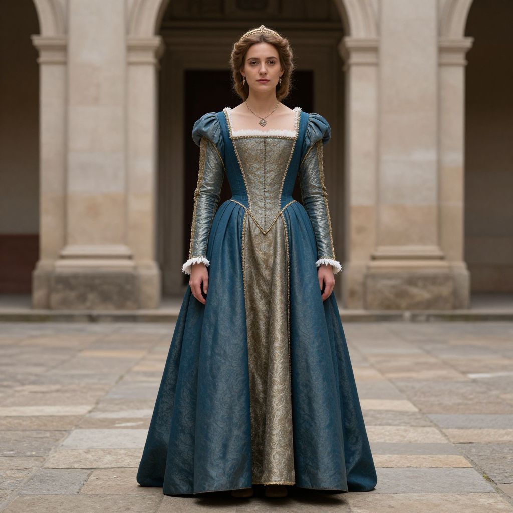 Photograph of a fair-skinned woman with brown hair in an elaborate 16th-century-style gown. She wears a silver tiara, a blue velvet dress with puffed sleeves, and an intricately embroidered gold bodice. The dress features white lace trim on the sleeves and neckline. She stands in a stone courtyard with arched columns in the background, under soft daylight. The gown's rich textures contrast with the rough stone floor and architectural details, creating a regal, historical ambiance. Her expression is serene, and she gazes directly at the camera.
