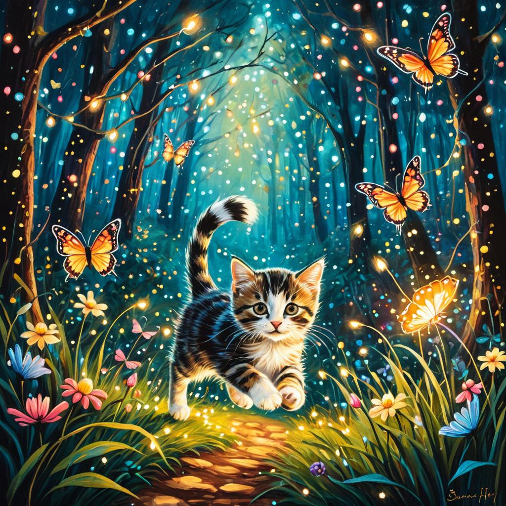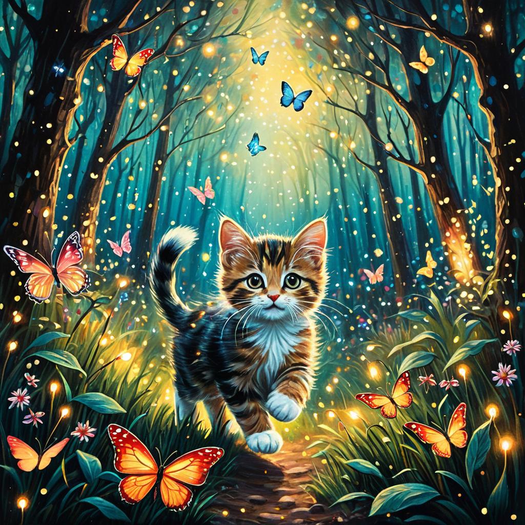 Playful kitten chasing colorful butterflies in an enchanted forest clearing with twinkling fairy lights, rendered in vibrant acrylic brushstrokes with a dreamy surrealism with glowing fireflies and a gentle warm color palette.