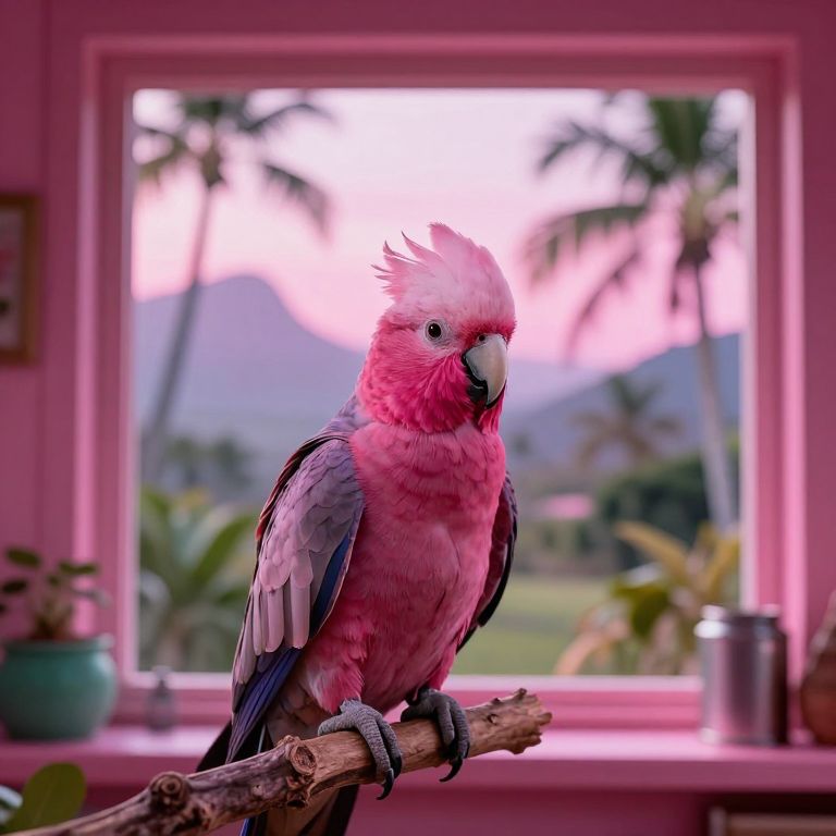 The image presents a vibrant and surreal scene dominated by a striking pink hue. A parrot, with its feathers vividly colored in shades of pink and purple, perches on a branch in the foreground, its gaze directed towards the viewer. The parrot's vibrant plumage contrasts sharply with the more muted tones of the surrounding environment. In the background, a window reveals a tropical landscape, complete with palm trees and a distant mountain range, bathed in a soft, pink light that permeates the entire scene. The window frame and the interior elements, such as a green pot and a metallic canister, are also tinted with the same pink hue, creating a cohesive and visually striking composition. The overall atmosphere is one of tranquility and otherworldliness, with the interplay of colors and textures adding depth and complexity to the image.