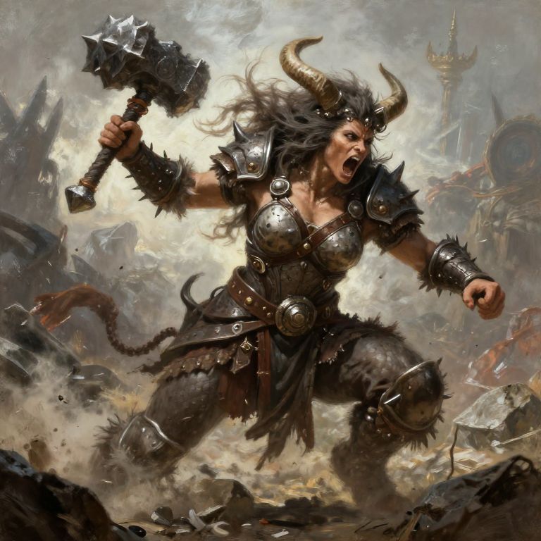 Female minotaur dnd barbarian charging into battle on a rocky battlefield, muscles rippling, fur and mane wild and flowing, wearing spiked armor, wielding a giant spiked mace, fierce war cry, dynamic action scene, epic fantasy style painting