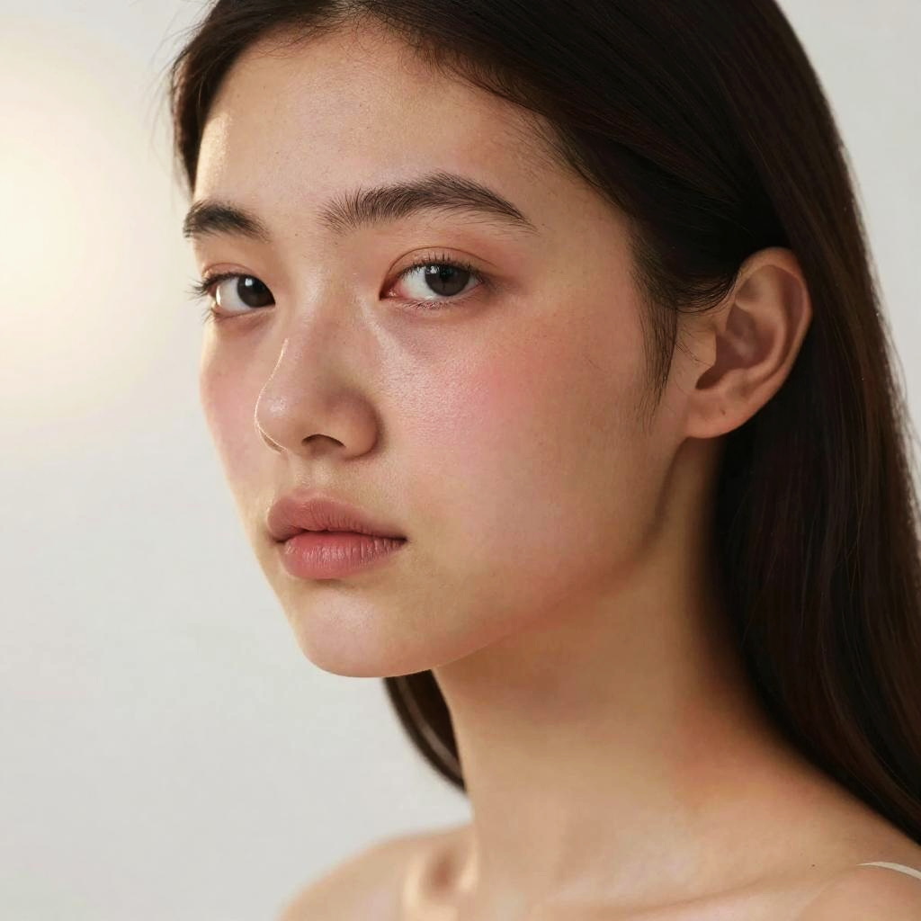 Close-up photograph of a young Asian woman with fair skin, long dark hair, light brown eyes, and natural makeup, set against a bright white background
